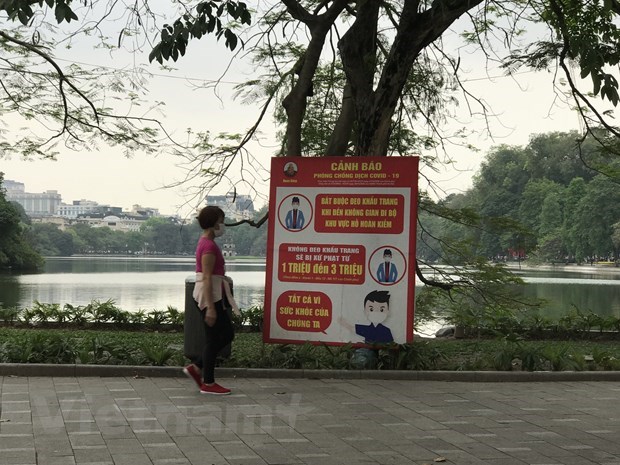 Hanoi, Hai Duong reinforce COVID-19 prevention efforts hinh anh 1A woman passes through a “face mask required” sign on downtown Hanoi’s Hoan Kiem Lake (Photo: VNA)