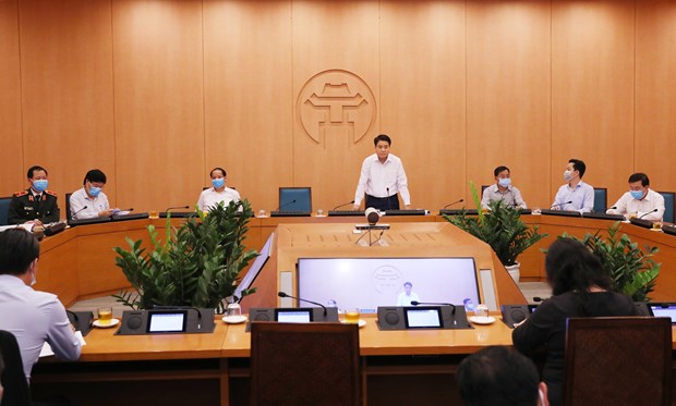 Hanoi works to prevent cross infection of COVID-19 among community hinh anh 1Chairman of the Hanoi People’s Committee Nguyen Duc Chung (standing) speaks at the event (Photo: VNA)