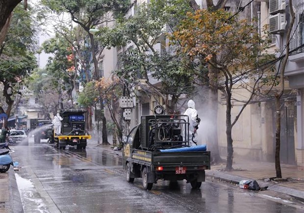 Soldiers of the spray disinfectant to sterilise Truc Bach street of Hanoi (Photo: VNA)Hanoi (VNA) – Soldiers of the Chemistry Army and Military Medicine Department under