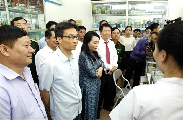 National pharmacy network officially launched hinh anh 1Deputy Prime Minister Vu Duc Dam (middle, second from left) and Minister of Health Nguyen Thi Kim Tien (third from left) inspect a retail drug store in Hung Yen, after the launch of a national network . (Photo: VNA)